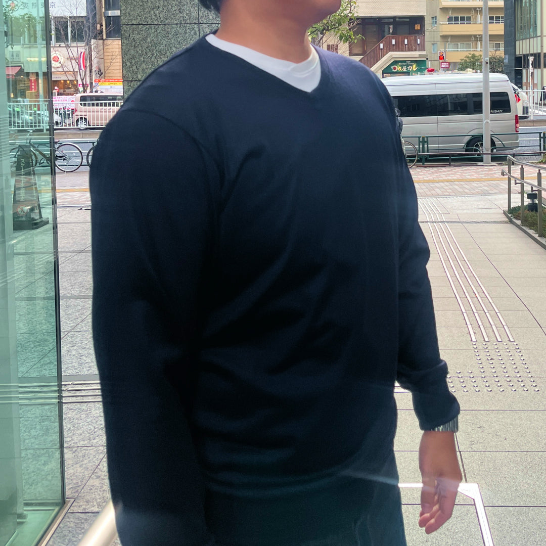 またNDTのネックデザインに合わせたVネックのため、NDTと重ねてきていただくいてもしっかり馴染みます。NDTと同じサイズ感で少しニットらしいゆとりが出るよう設計しております。お洗濯により少し縮みますが、タイト目がお好みの場合はNDTよりワンサイズ下げていただくとフィットするかと思います。