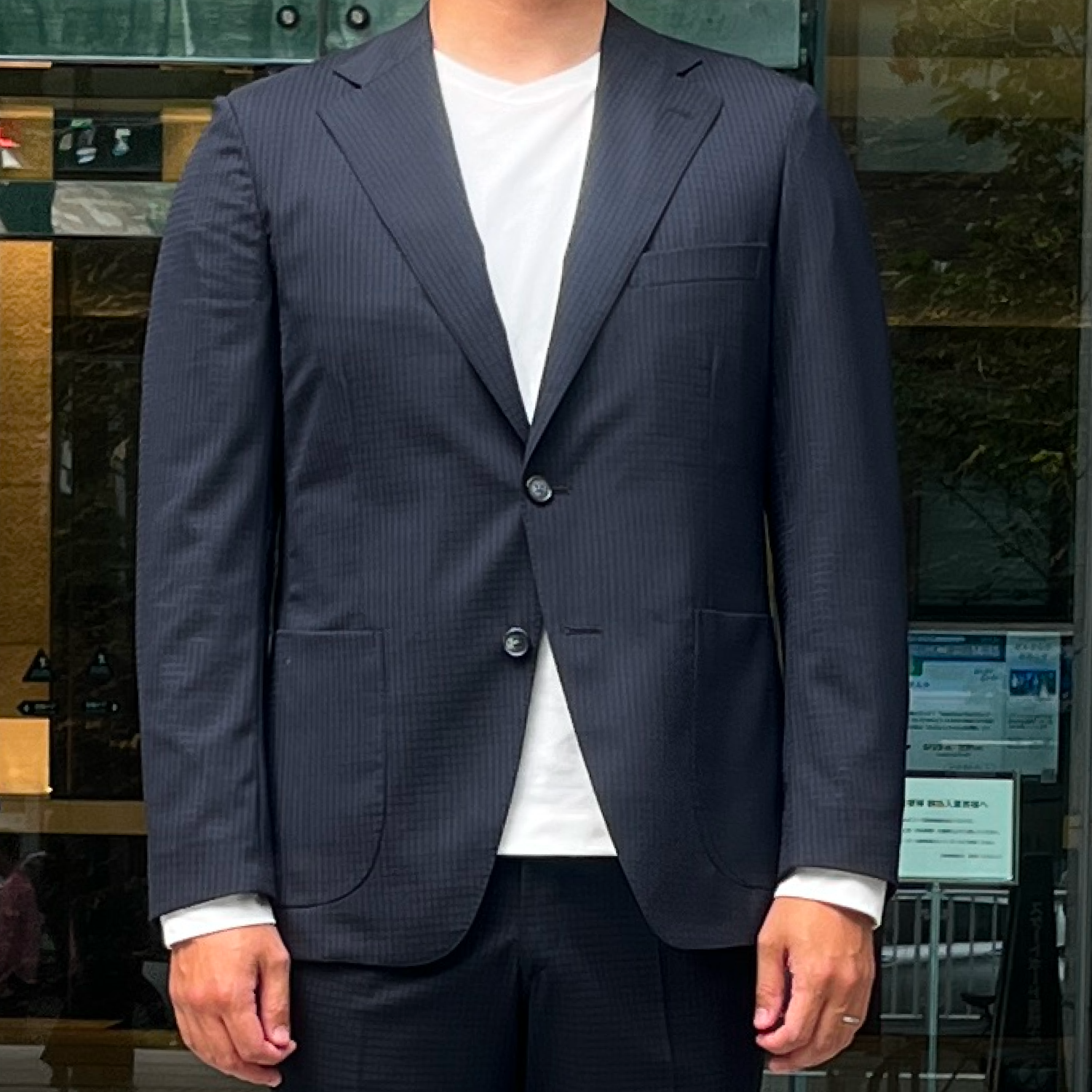 Tシャツの着用を想定し、ラペル巾を少しだけ広げ、ネクタイのないスタイルでもジャケットが違和感なく合うようにしています。